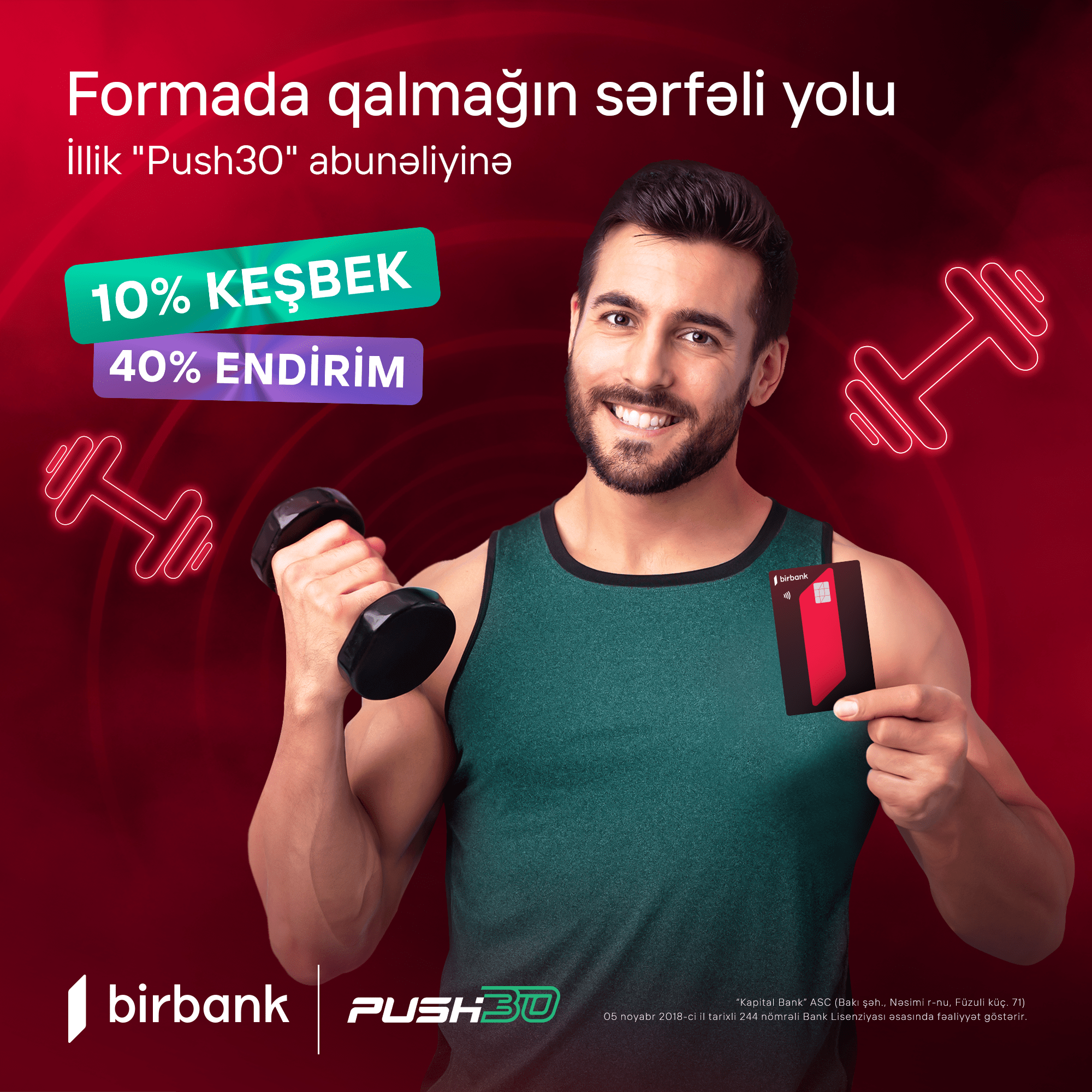 Sağlam həyat tərzi yaşayıb idmanı və formada qalmağı sevənlər bol keşbek qazanmağa davam edirlər. Belə ki, illik “Push30” ödənişlərini Birbank kartı ilə birdəfəlik edən abunəçilər nə az, nə çox 10% keşbek qazanırlar. Fit qalmaq Birbank kartları ilə daha sərfəlidir. Kampaniyanın müddəti 30 sentyabr 2024-cü il tarixinədək keçərlidir.