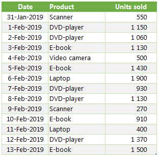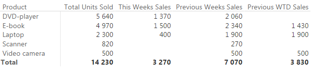 DAX-ın (Data Analysis Expressions – Power Pivot, Power BI və SQL Server Analysis Services (SSAS) tabular modellərinin formul və sorğu dilidir, öncədən müəyyən edilmiş hazır formullardır (funksiyalar)) ən ciddi xüsusiyyətlərindən biri zamana indeksli saysız funksiyası olmasındadır. İstər bu günün, istərsə də keçən ayın, kvartalın və ya ilin eyni dövrünün müqayisəsi sadə formullarla mümkündür. Lakin əsas çatışmayan cəhət – həftə indeksli müqayisələrin hazır funksiyalarının olmamasıdır. Bunu aşmanın, əlbəttə ki, yolları mövcuddur və bu mövzuda məhz həftəlik müqayisələrin aparılmasını müzakirə etmişik. İstifadə edəcəyimiz InputTable adlı sadə cədvəlimiz aşağıdakı kimidir: