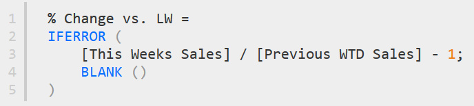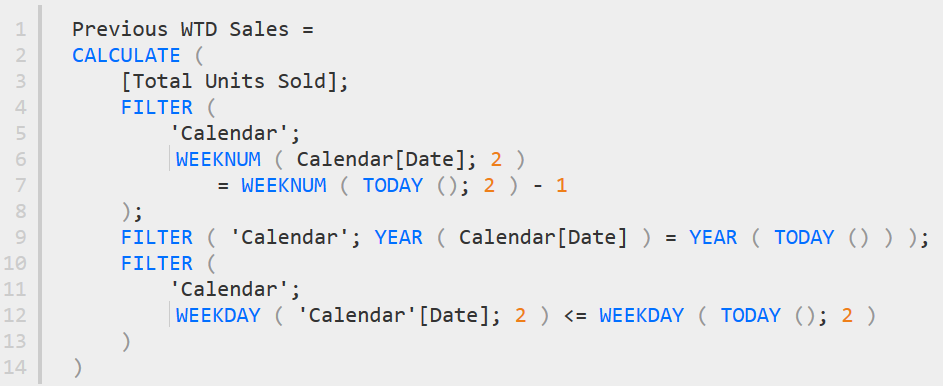 Bu dəfəki measure (Previous WTD Sales adlı) digərlərindən daha uzundur, lakin bu, sizi qorxutmasın, çünki bir əvvəlki formula sadəcə tək bir sətir əlavə edilib.