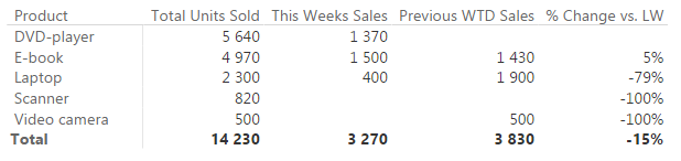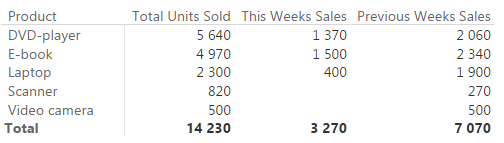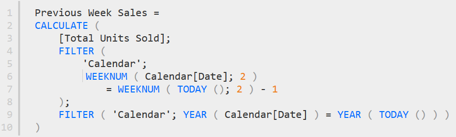 Hər hansı bir ciddi məntiq dəyişikliyinə getmədən, yuxarıdakı DAX formulunda çox kiçik bir dəyişiklik etməklə, keçən həftənin satışlarını hesablaya bilərik. Bu dəfə, həftə nömrəsi olaraq “bu həftə minus 1” olaraq nəzərə almalıyıq.