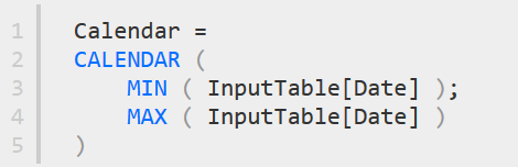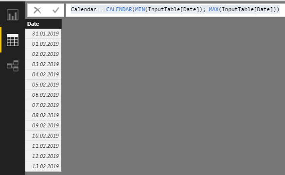 Əməliyyatlara başlamadan öncə, Təqvim formatlı yeni bir cədvəl qururuq. Bunun üçün, Modeling >> New Table ünvanına gedib, formul çubuğunda CALENDAR funksiyasından istifadə etməklə, əlavə etdiyimiz InputTable adlı cədvəlimizdəki ən kiçik tarixlə ən böyük tarix arasındakı bütün tarixlərdən əmələ gələn yeni Calendar adlı cədvəl qururuq.