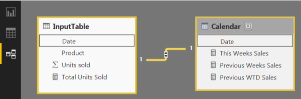 Relationships blokuna gedib, InputTable ilə Calendar cədvəlləri arasında Date üzərindən əlaqəni qururuq.