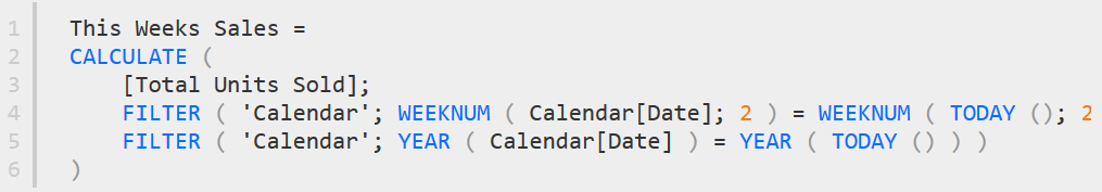 Növbədə, bu həftənin satışlarını hesablayacaq DAX formulu var.