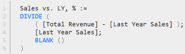 İndi isə, gəlin, keçən bu illə keçən il arasındakı dəyişimin faizini hesablayaq. Bu məqsəd üçün, 2 yeni DAX funksiyasından istifadə edəcəyik: DIVIDE və BLANK.