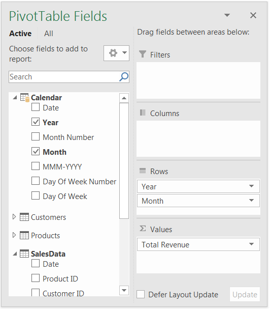 CALCULATE funksiyası öncə, daxilində yer alan və filter vəzifəsi görən SAMEPERIODLASTYEAR funksiyasını oxuyur və bizə lazım olan filter kontekstini müəyyən edir. Daha sonra, bu kontekstə uyğun [Total Revenue] measure-nı formalaşdırır. Gəlin, yeni measure-mızı pivot cədvəlimizə əlavə edib analizimizə davam edək.