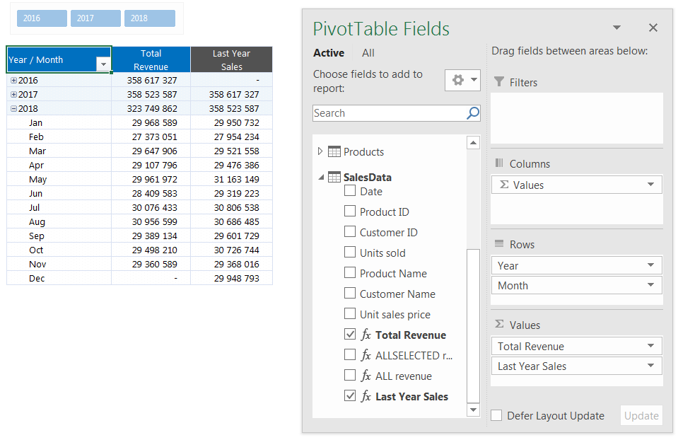 Total Revenue adlı pivot sütunumuzun yanında, keçən il eyni dövrdəki satışları hesablamaq üçün formulumuz bu olacaq: