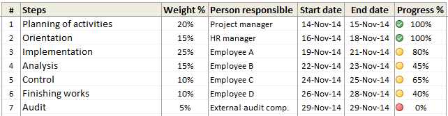 Diqqət etməli olduğumuz son nyuans isə, Progress % sütunundakı addımın tamamlanma dərəcəsini müəyyən etməkdir. Yəni, layihə rəhbəri olaraq, o və ya bu addımın neçə faizinin tamamlandığını düşünürsünüz? Təxmini faiz dərəcəsi. Amma mütləq daxil edilməlidir. 100% tamamlanmış işlər yaşıl, 30%-100% arası tamamlanmış işlər sarı, 30%-dən aşağı görülən işlər isə qırmızı dairə ilə diqqətimizə çatdırılır. Beləliklə, nəyin hansı mərhələdə olduğunu, hansı addımın yubandığını və s. vizual olaraq müşahidə edə biləcəyik.