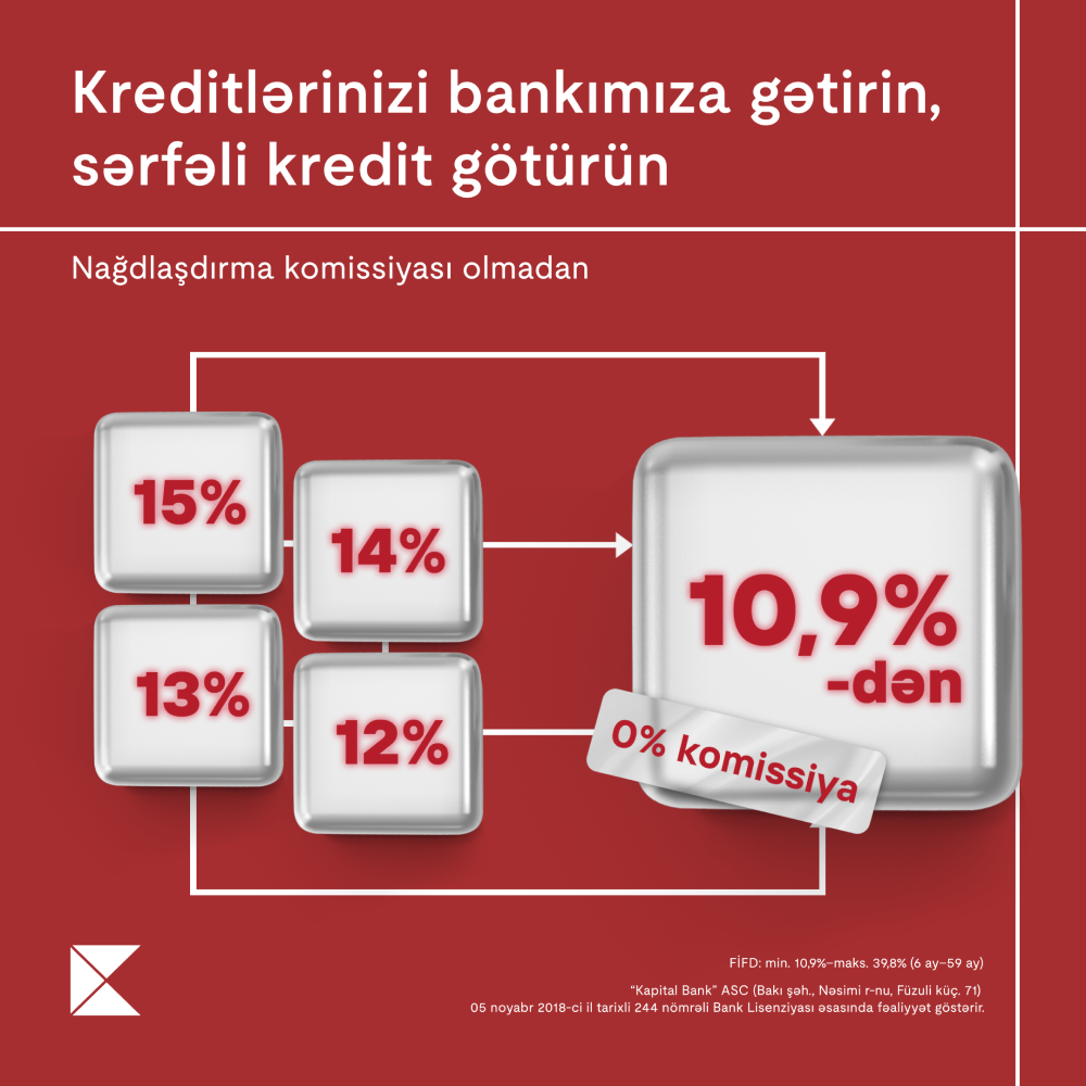 Kampaniyadan yararlanmaq üçün 1 yazıb 8196 nömrəsinə göndərə və ya sizə ən yaxın Kapital Bank filialına yaxınlaşa bilərsiniz. Xatırladaq ki, Kapital Bank-dan 10.9%-dən başlayan xüsusi şərtlərlə 50 000 AZN-dək nağd kredit əldə etmək mümkündür.