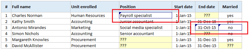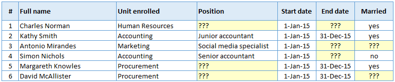 Şirkətimizə yeni gələn işçilərin qeydiyyatın aparıldığı bir cədvəldir. Bu cədvəli 1-dən çox işçinin doldurmalı olduğunu fərz edək. Görürük ki, sarı ilə işarələnmiş bəzi xanalarda məlumat çatışmazlığı var və bu məlumatı birdən çox insan doldurduğu zaman, kimin hansı məlumatı hara daxil etdiyini izləmək qeyri-mümkün olacaqdır.