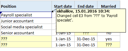 Daha öncə boş olan xanaları doldurduqdan sonra, həmin xanaların göy çərçivəyə alındığı və sol üst künclərində göy üçbucaq əmələ gəldiyini görürük. Bu, həmin xanalarda dəyişiklik edildiyini göstərir. Kimin dəyişdirdiyini görmək üçün isə, mouse-un kursorunu həmin xananın üzərinə gətirməyimizi kifayətdir.