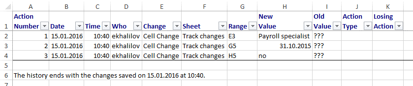 Bəzən eyni fayl bir neçə nəfər tərəfindən eyni dövr ərzində istifadə olunur. Fayla əlavələr edilir, yanlışlar silinir və s. Belə olan halda, aradakı qarışıqlığı minimuma endirmək və tamamilə yox etmək üçün, hər kəsin etdiyi dəyişikliyin qeydiyyatının aparılması zəruridir. Aşağıdakı HR cədvəlinə nəzər yetirək.