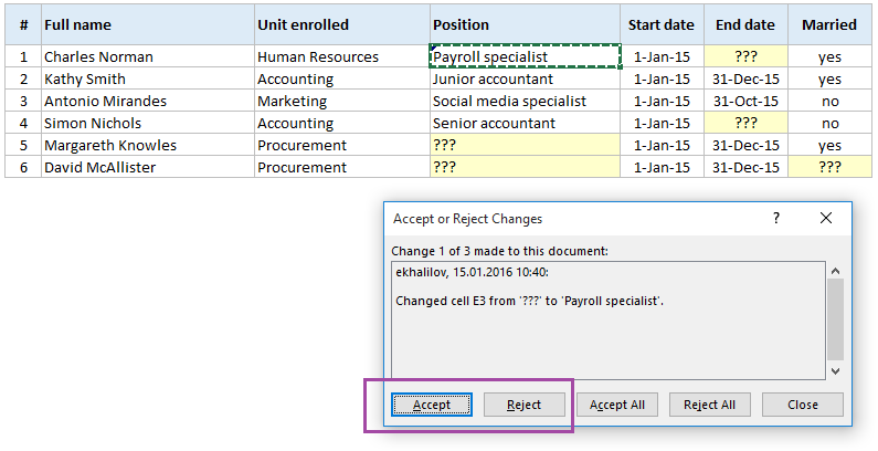 Excel, hər dəyişiklik etdiyimiz xananı bizdən soruşaraq Accept və ya Reject etməmizi istəyəcəkdir. Əgər faylda heç bir problem yoxdursa, hamısını eyni anda Accept All edə, və ya bir-bir yoxlayaraq, səhv məlumatları Reject edə bilərik.
